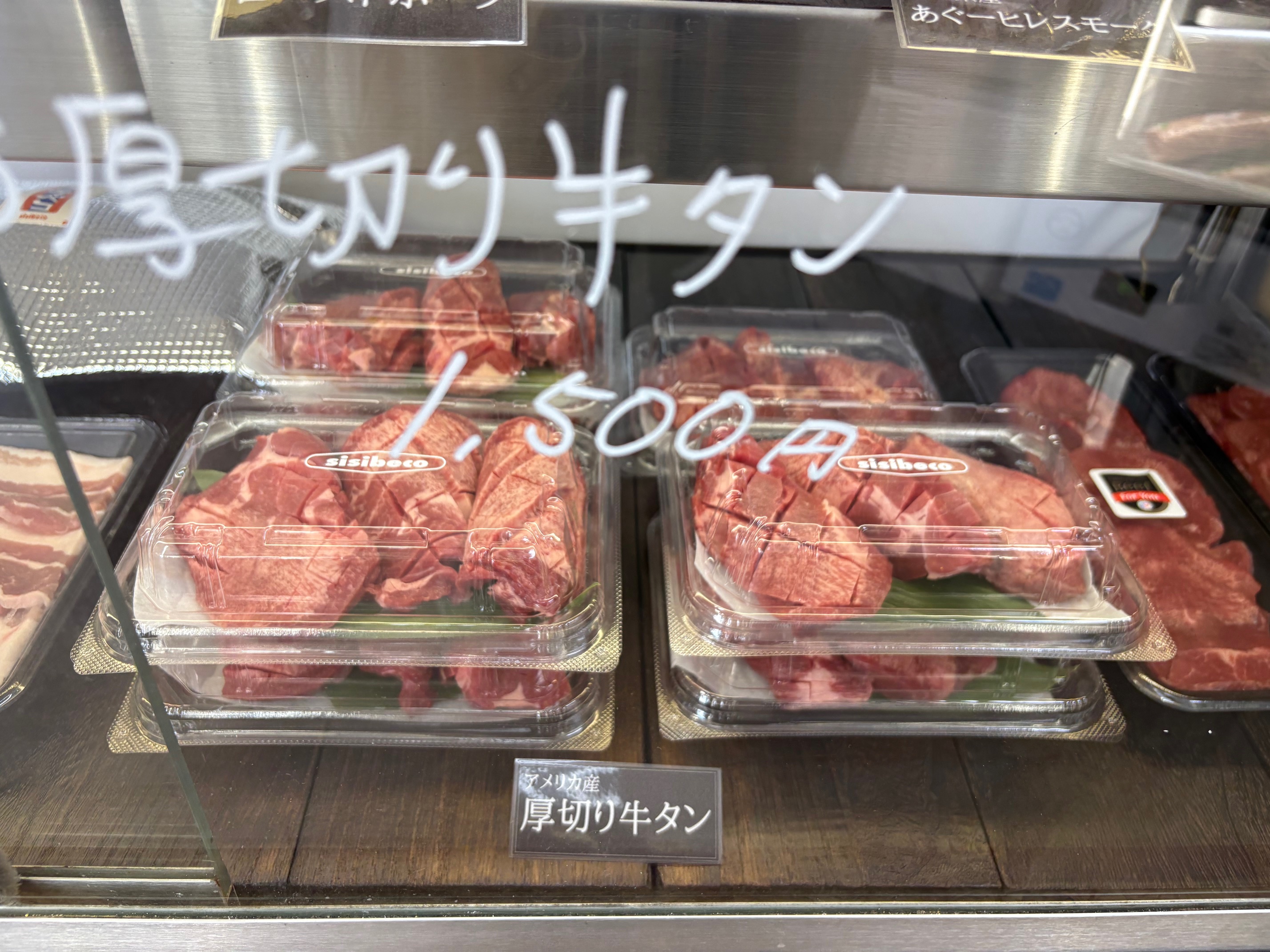 私のおススメは、レジ前のショーケースにある「厚切り牛タン」と「白センマイ刺し」です。